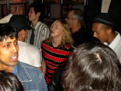 I had the ultimate privilege of dancing with Madonna last night at SL Club in the Meatpacking District (I can officially check this off of my "Things I Want To Do Before I Die" list). She was there on the 'hush-hush' auditioning dancers for her upcoming tour and—thanks to my boyfriend who was one of the DJ's invited to spin at the exclusive event—I got to get my groove on with her. Unfortunately photo taking was strictly prohibited. (The second I broke out my little Coolpix camera I was politely shut down.) Of course I managed to sneak in a shot or two (sorry Madonna, but I just HAD to). They don't do her justice, but believe me when I tell you she looked absolutely fresh-faced and fabulous—not much makeup and rocking a skin tight black and red minidress, black thigh-high boots and black fingerless gloves. My childhood dream....come true!